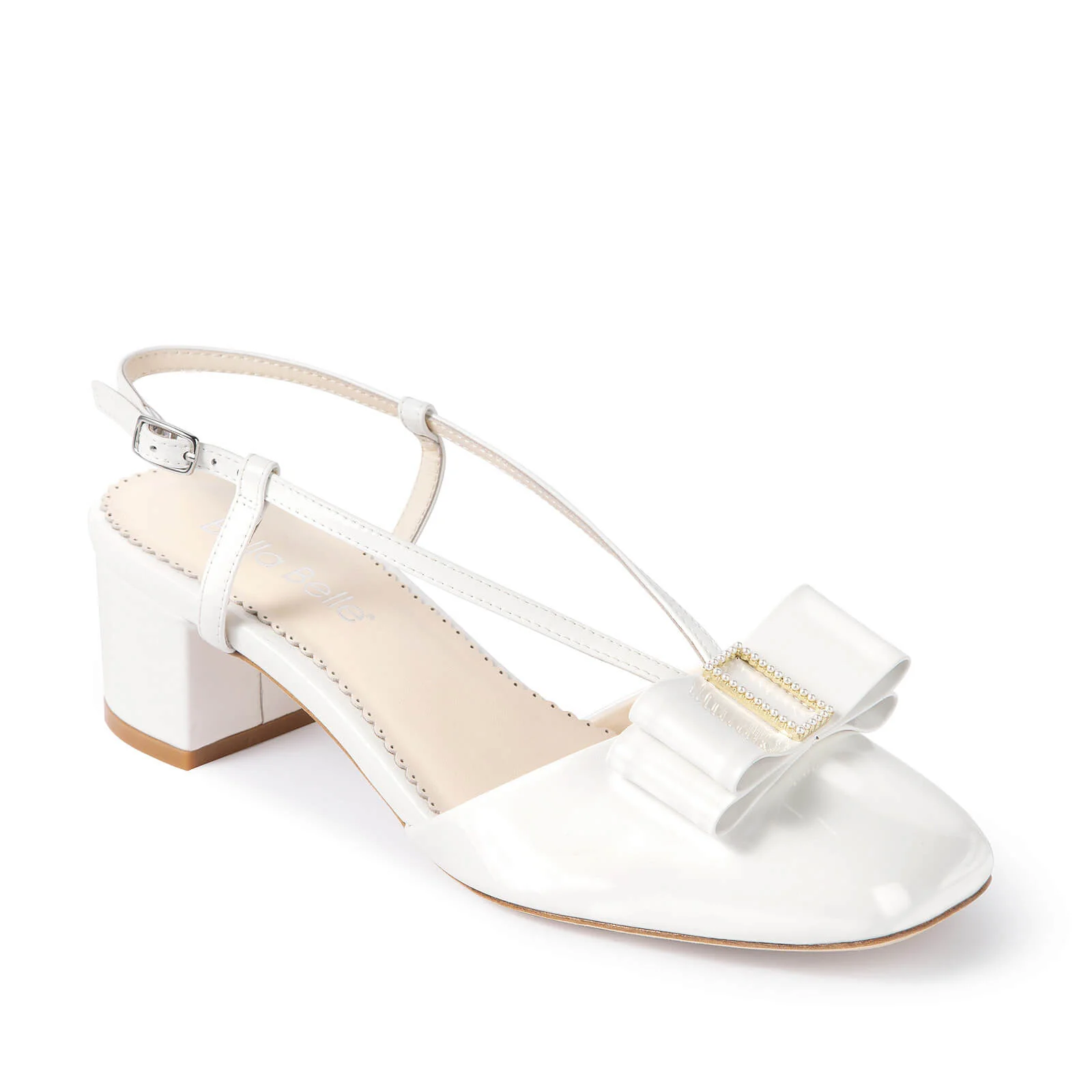 A 2-inch patent leather block heel featuring a square toe, adjustable slingback straps, and a folded bow accented with pearl hardware. Ultra-plush leather insoles ensure easy comfort, making this style a polished choice for bridal or after-party looks.