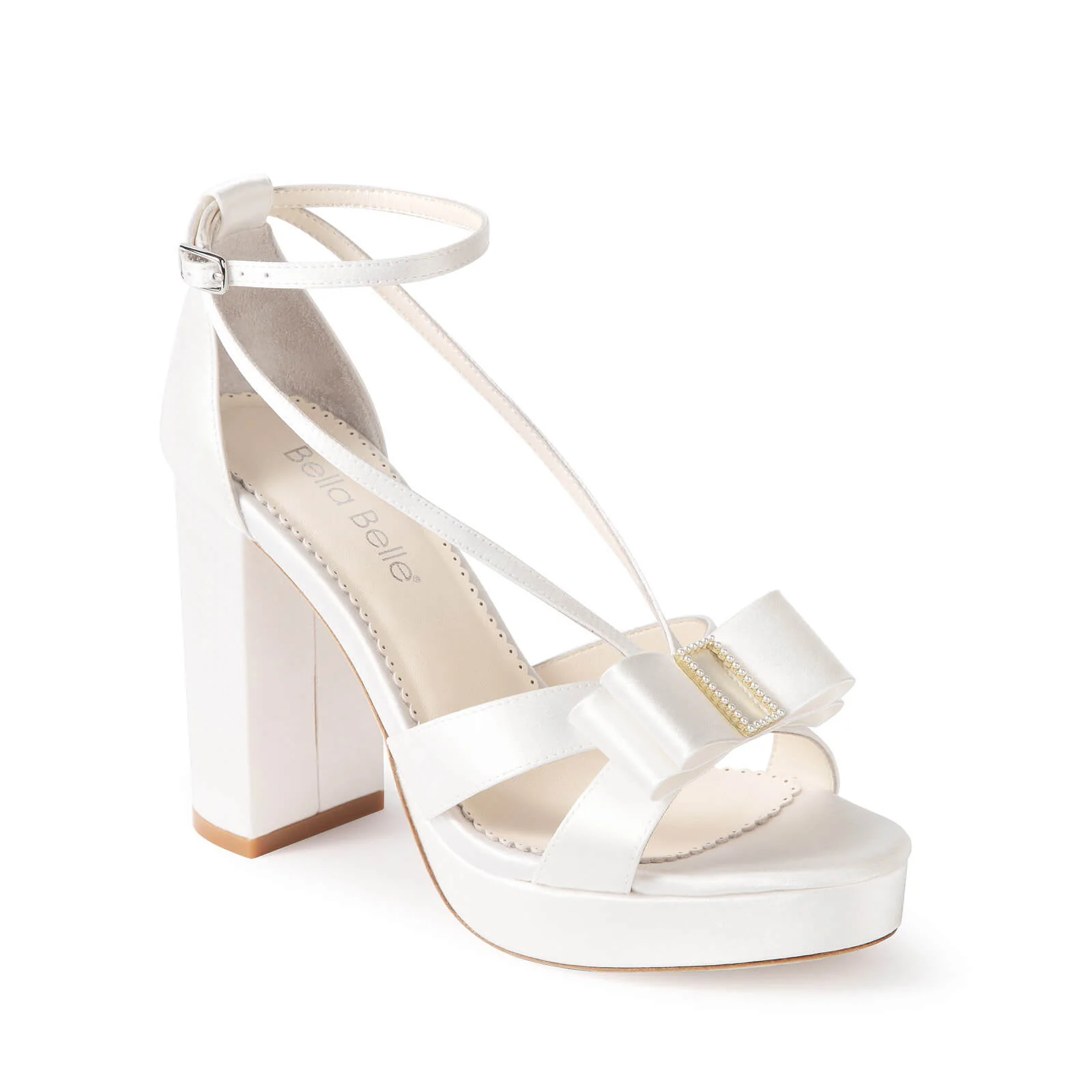 With a 4-inch heel and supportive ¾-inch platform, this design offers lift without strain. A folded bow accented with pearl hardware adds personality, and cushioned insoles plus adjustable straps keep every step comfortable.