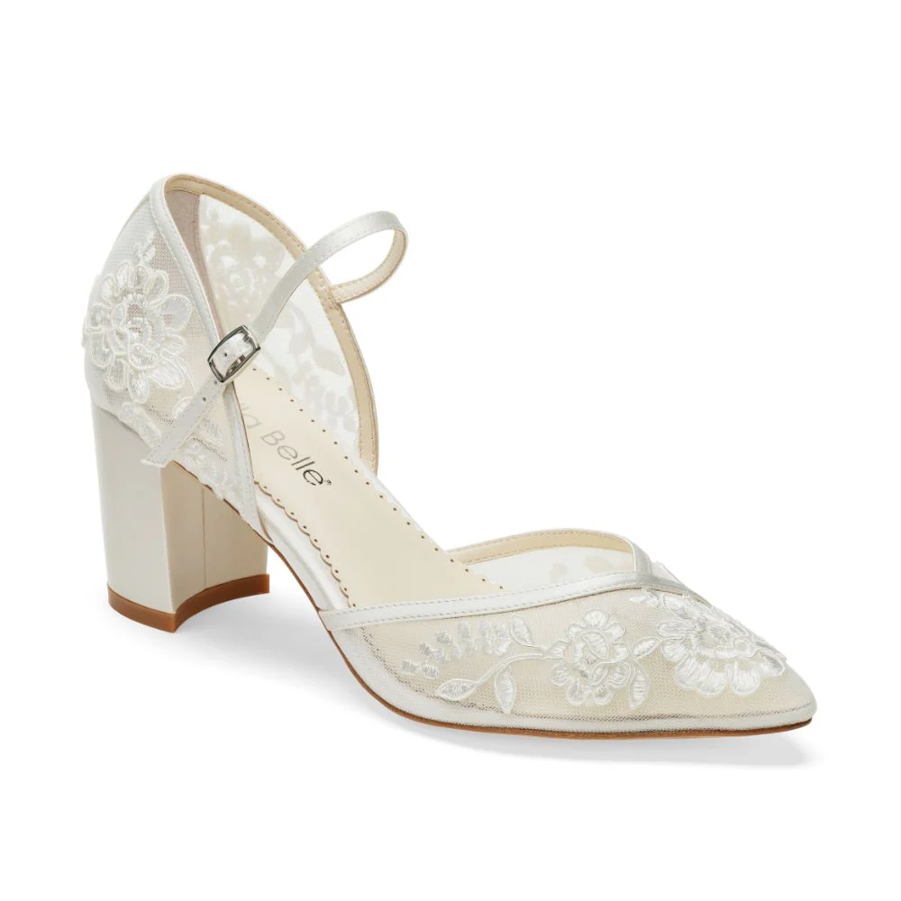 Chelsea Ivory 3-inch lace block heels combine timeless elegance with all-day comfort. Chelsea is designed with a breathable illusion mesh, embroidered floral lace, secure ankle straps, and sturdy block heels to ensure stability from the ceremony to the dance floor. It is the perfect wedding heel for effortless beauty, comfort, and support.