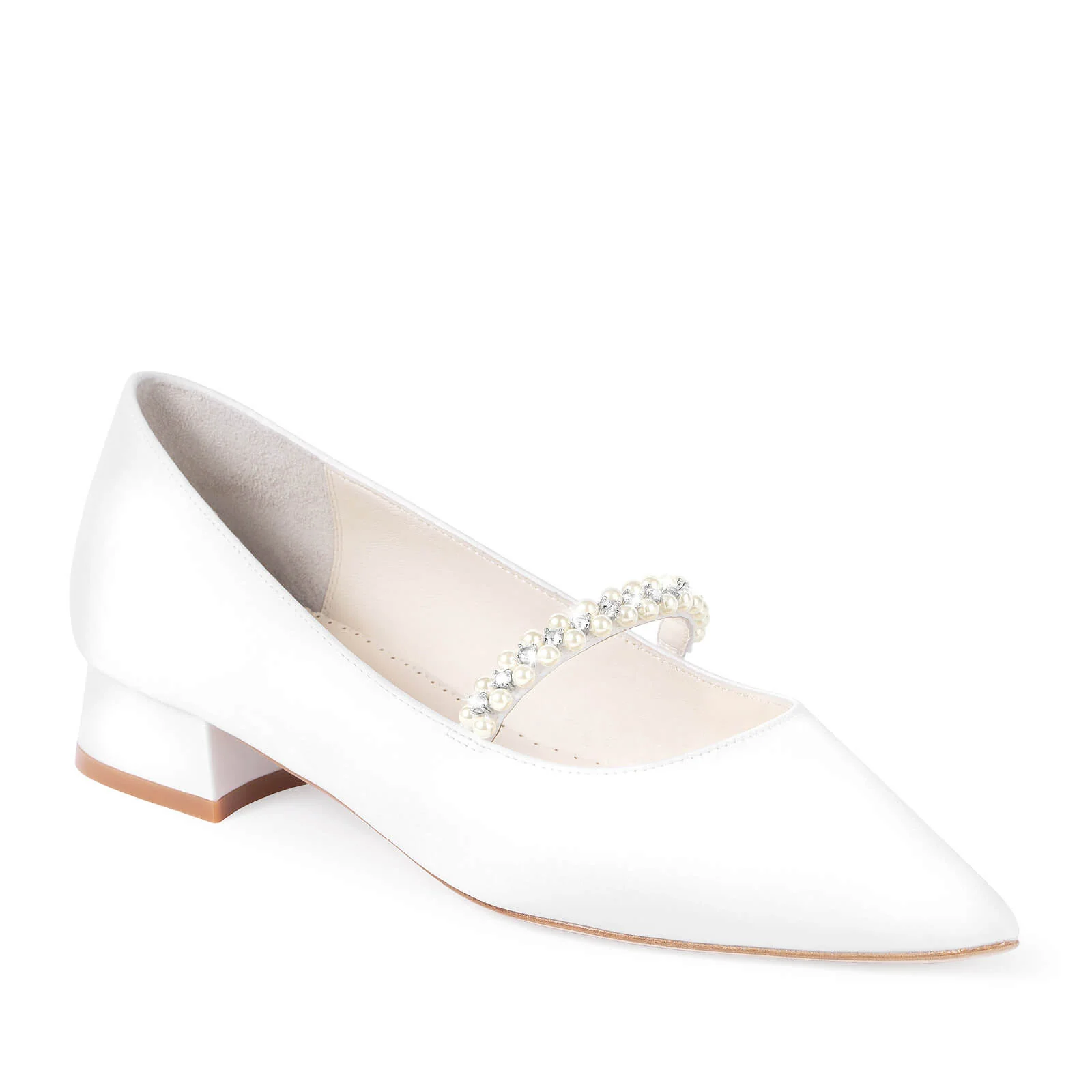 Lucy brings timeless elegance in a 1-inch silk bridal flats, featuring a pointed toe and a pearl-and-crystal embellished mid-strap for soft sparkle. Finished with plush cushioned insoles, these ballerina-inspired flats deliver effortless comfort from ceremony to celebration.