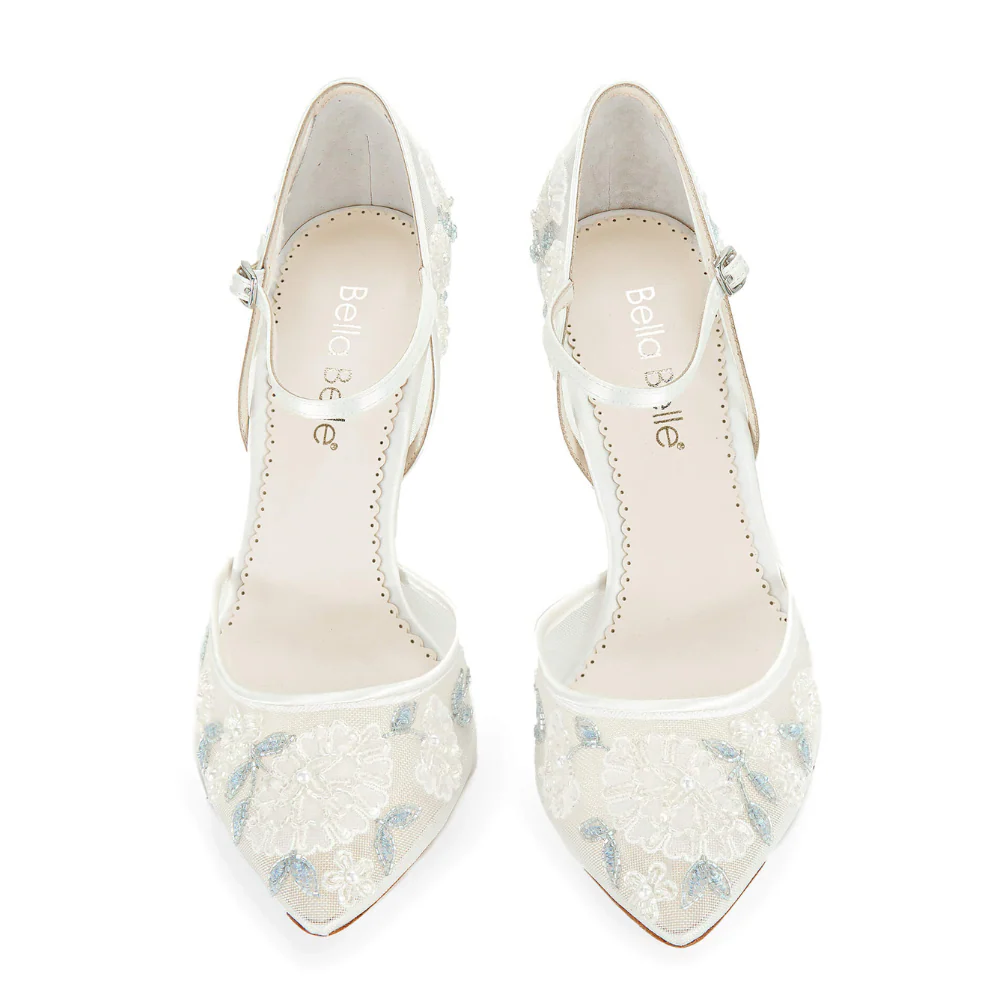 Romantic and elegant, Viola 3.25 inch blue and ivory wedding shoes are adorned with hand-beaded ivory flower buds and luminous pearls on soft, pliable mesh. The adjustable ankle strap offers a secure, making these floral wedding shoes the perfect "something blue."